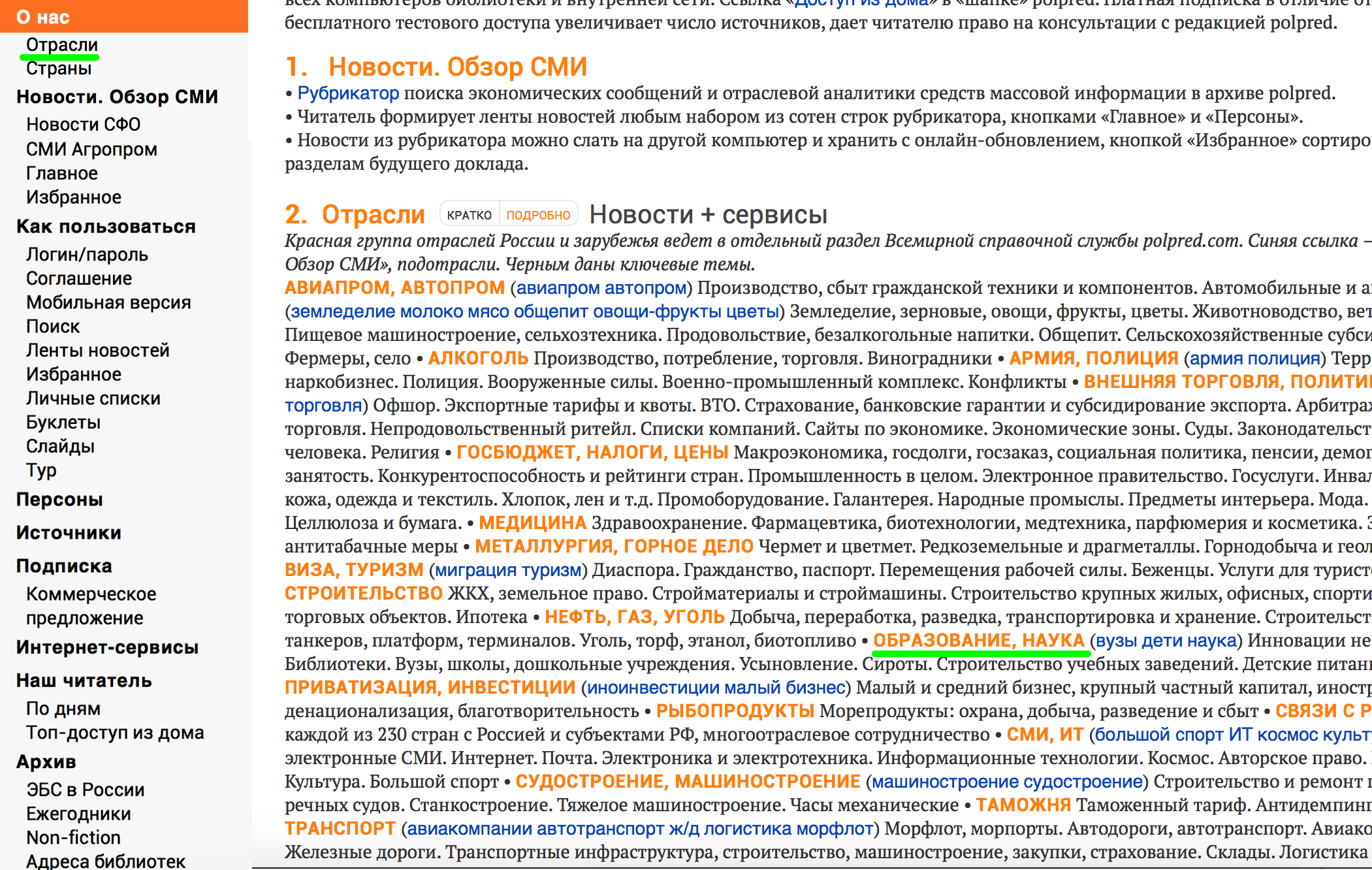 В меню слева вы выбираете подраздел «Отрасли» и попадаете на список из 26 групп отраслей экономики, каждая из которых ведет на отдельный сайт (2) Всемирной справочной службы polpred.com. Синие ссылки ведут на рубрикатор «Новости. Обзор СМИ» (3) — это подотрасли (более узкая тематика внутри выбранной отрасли). Черным даны ключевые темы деловых публикаций.